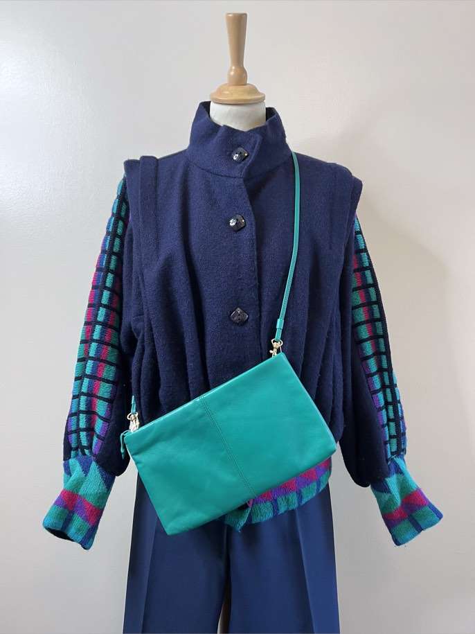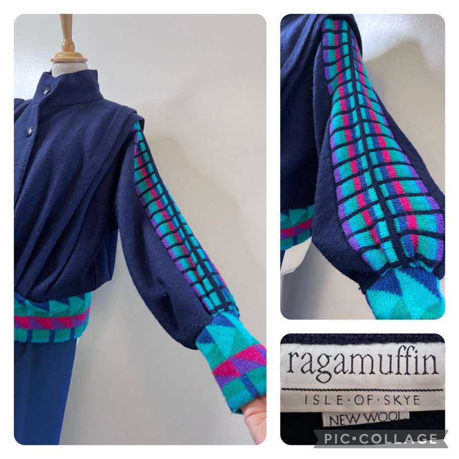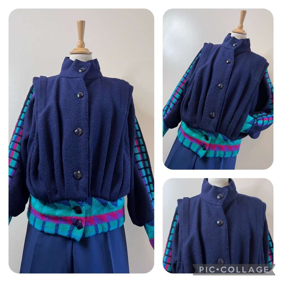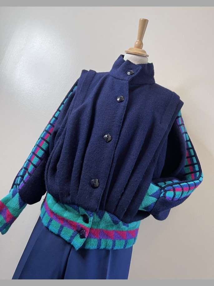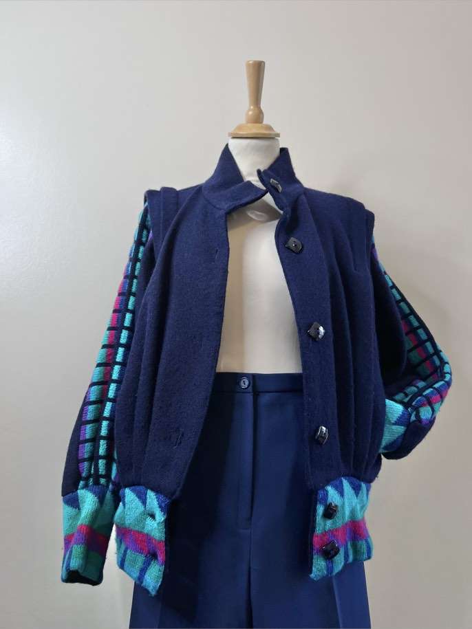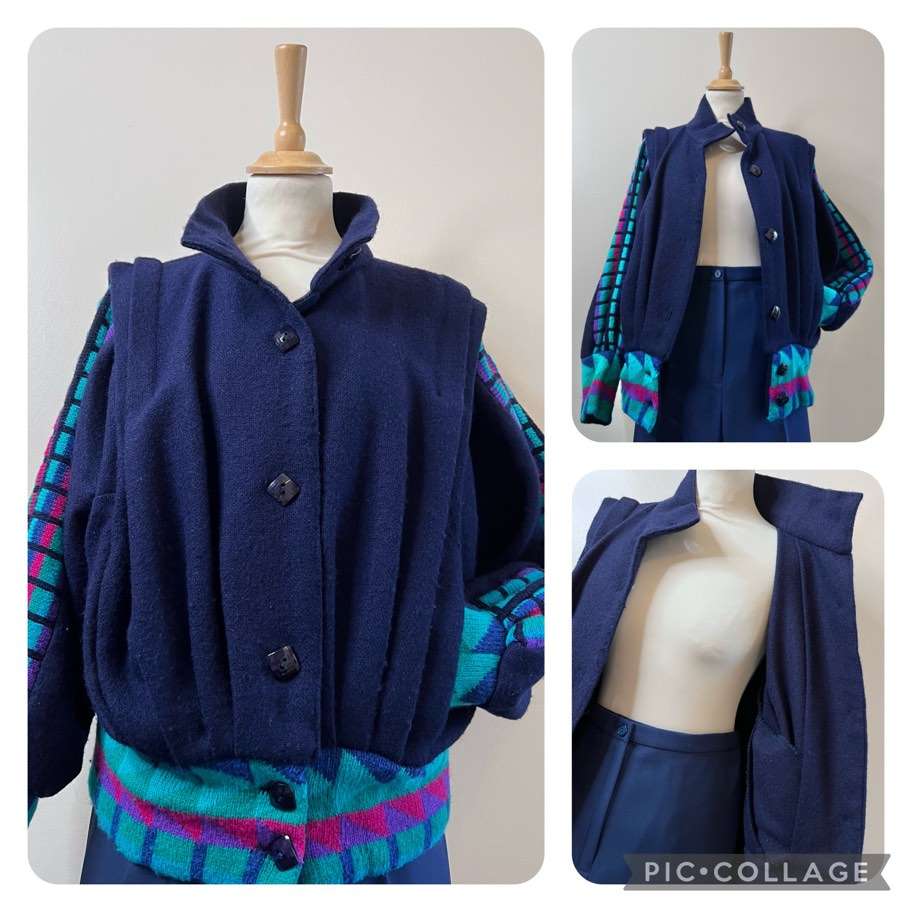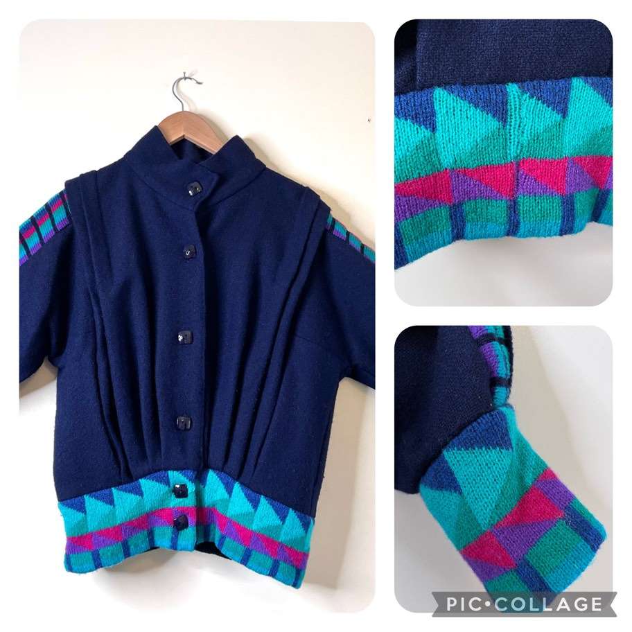 Description: Top quality, button up cardigan. Wonderful, dark navy base with eye catching contrasting jewel colours running down arms, around hem and cuffs in an Aztec style design. Wonderful, original, self coloured, shaped buttons. Blouson style fit. Lovely details – double pleats running from shoulder to hem. Great stand up collar.