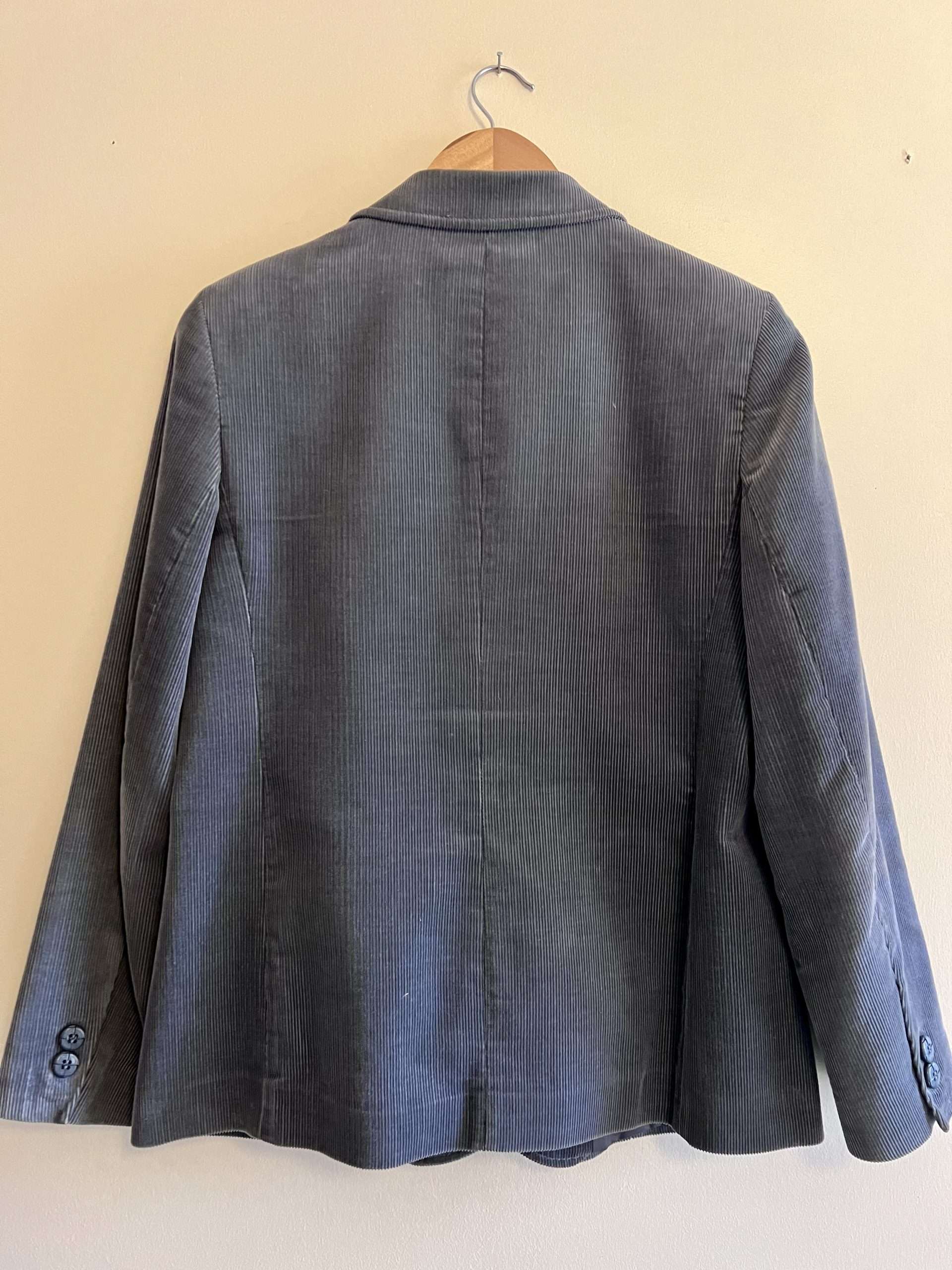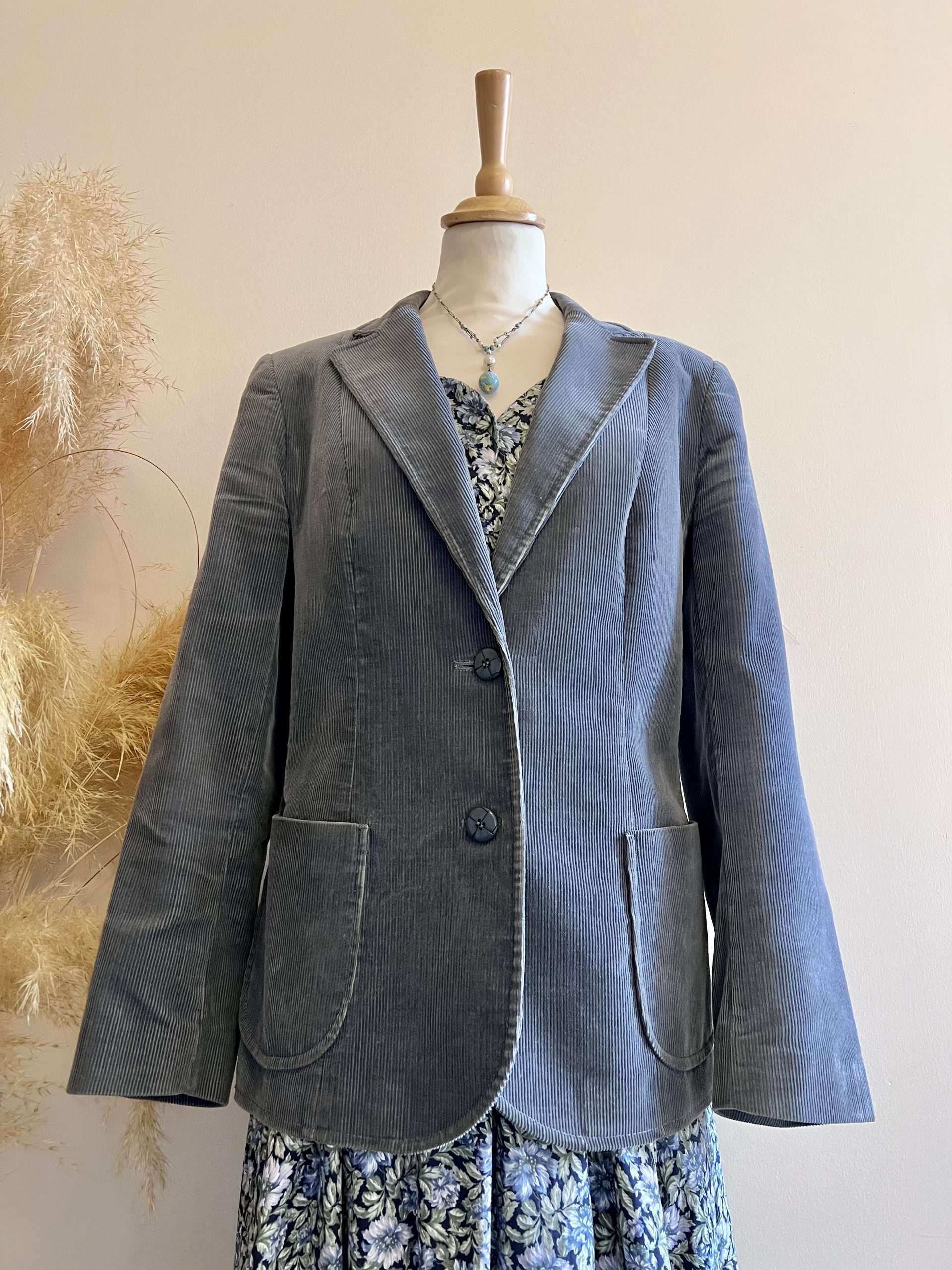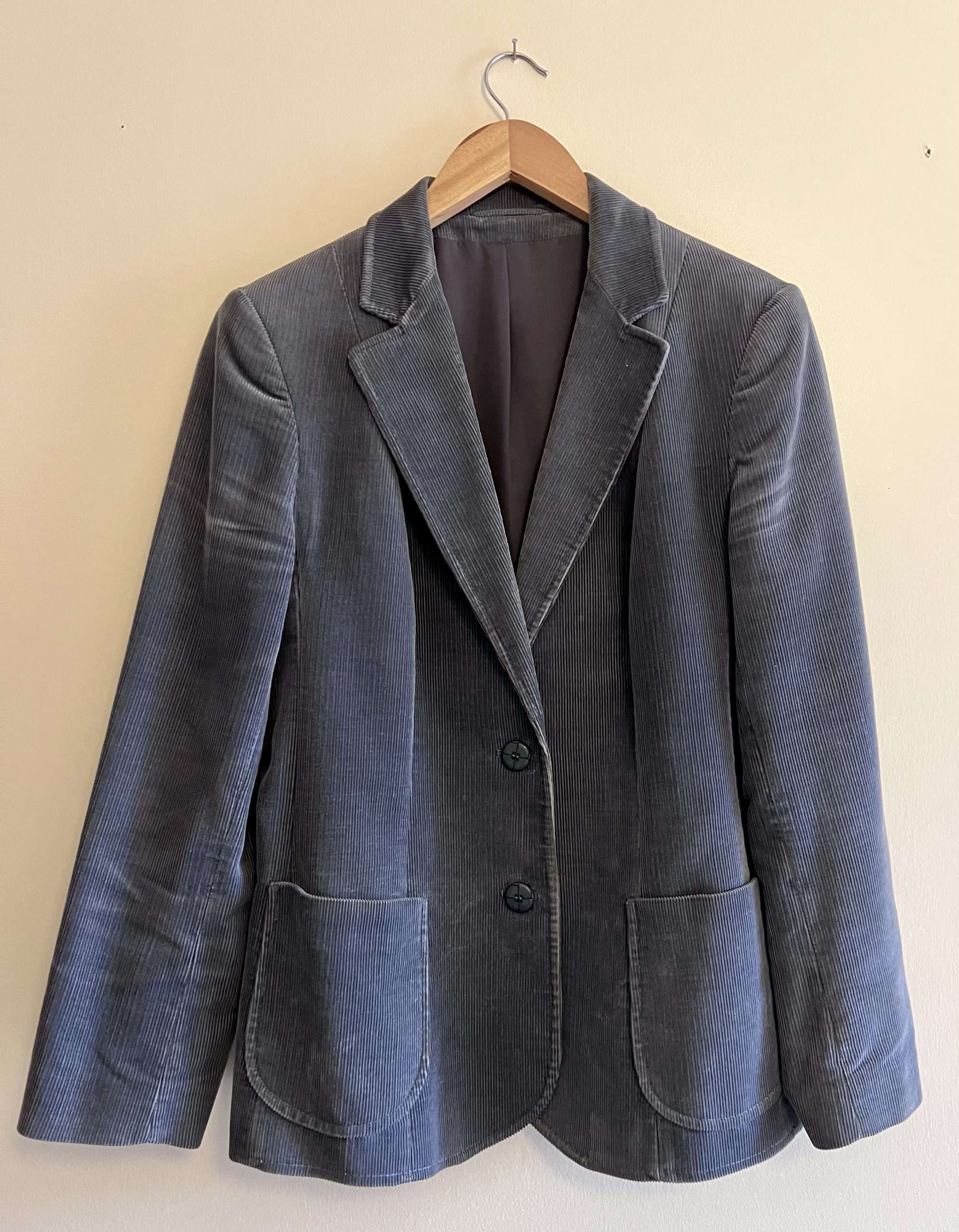 Description: Classic vintage staple. Neat & tidy, versatile & wearable. Dark grey cord blazer. X2 cute patch pockets at front & double button fastening. Fully lined.