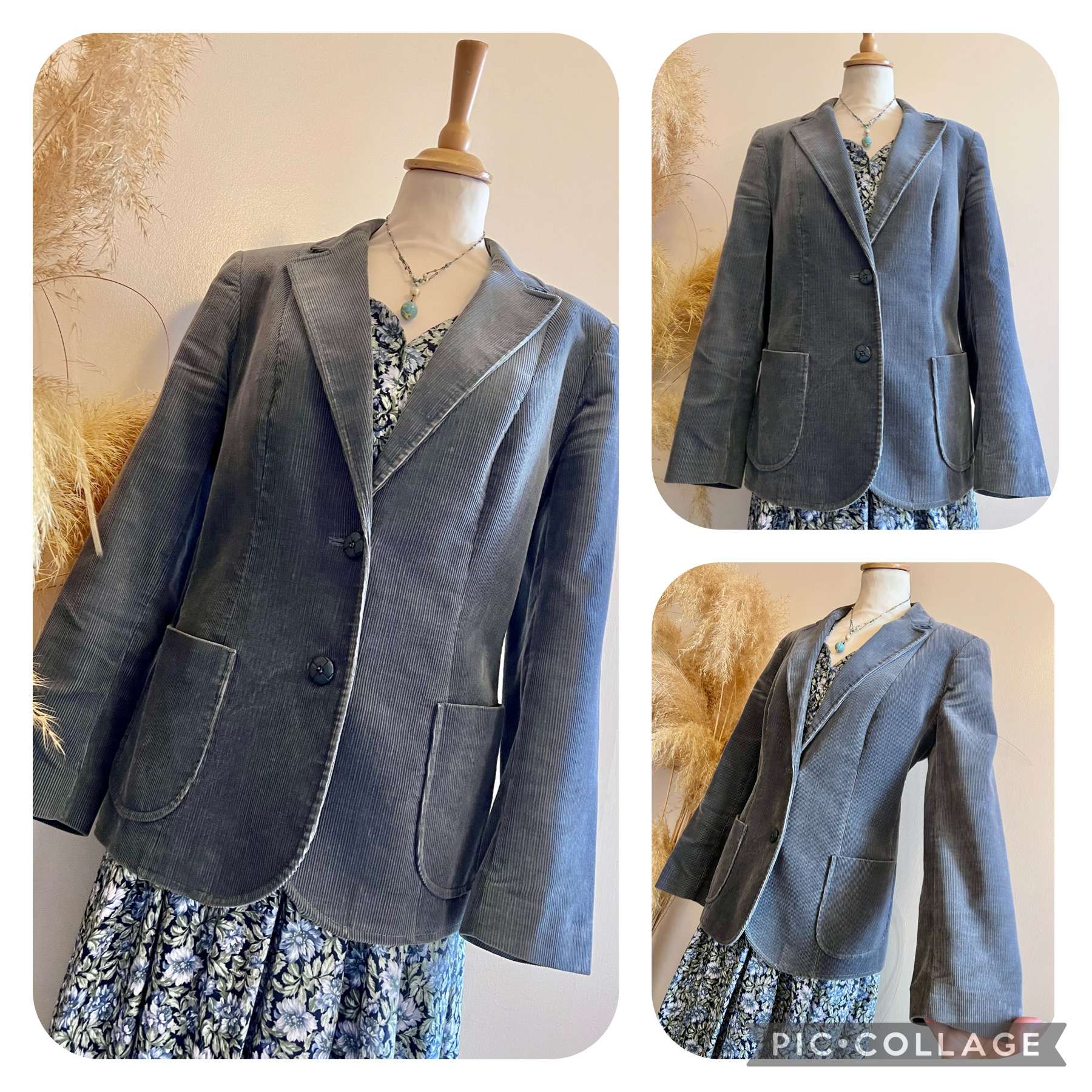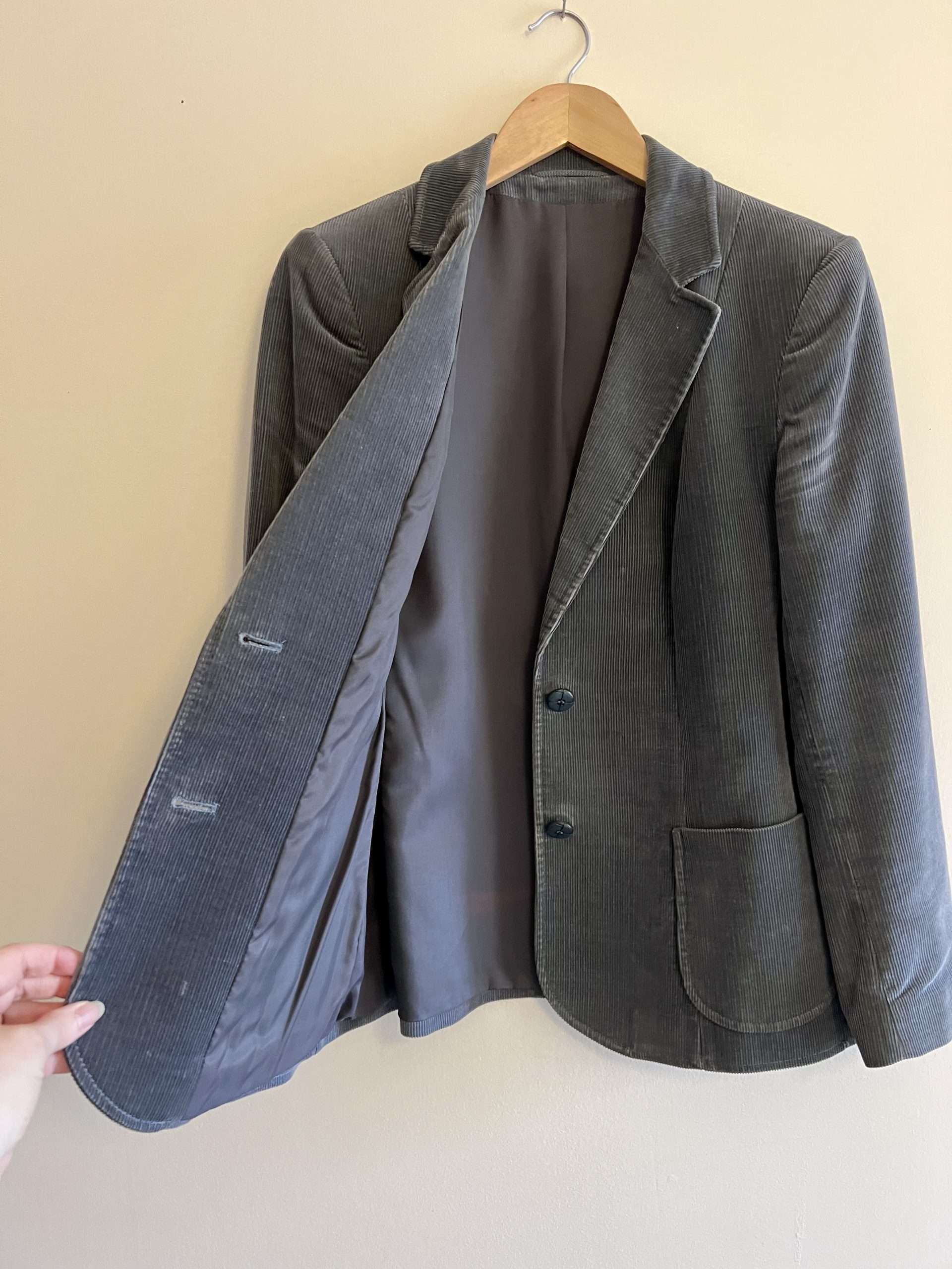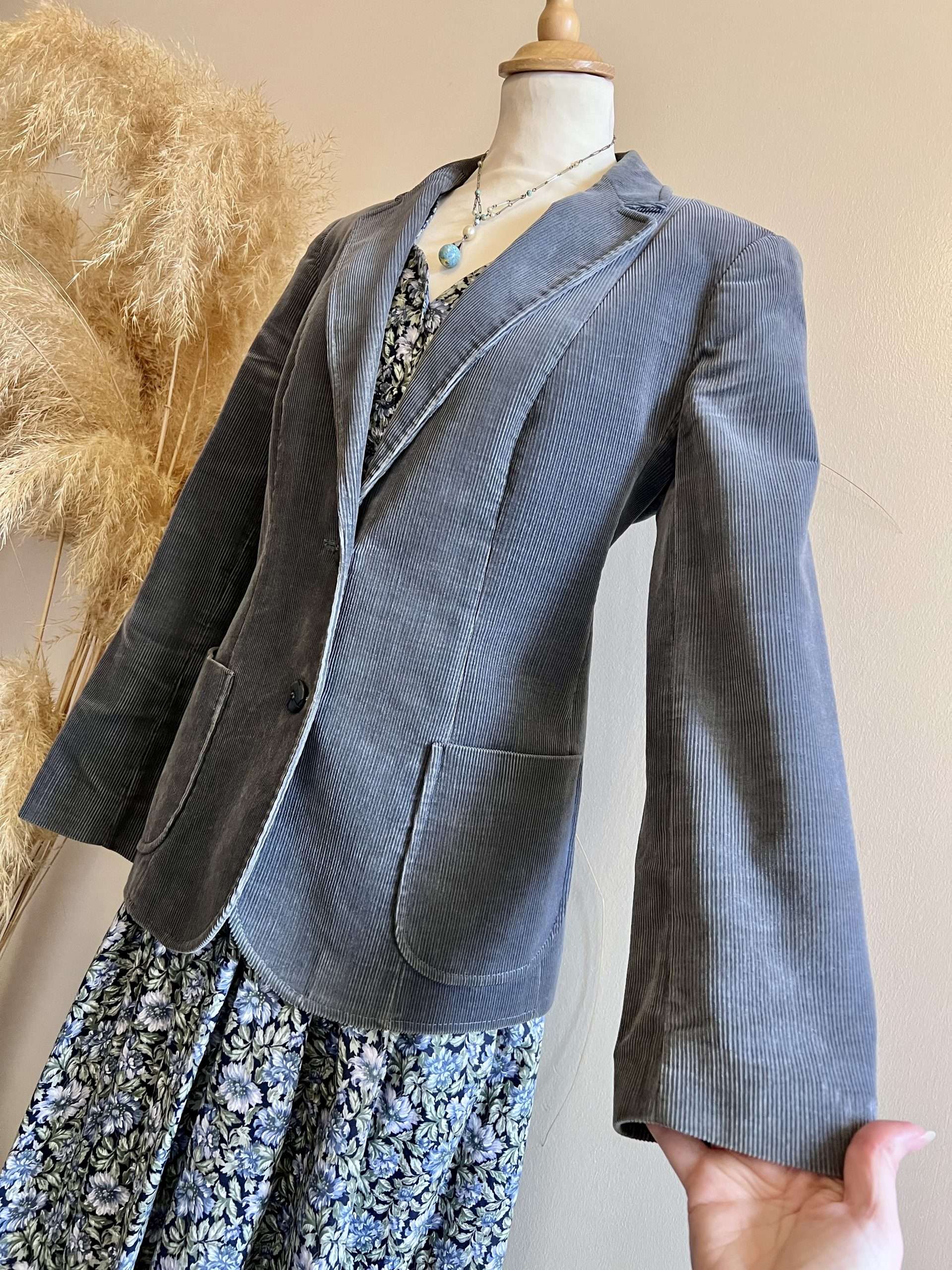 Description: Classic vintage staple. Neat & tidy, versatile & wearable. Dark grey cord blazer. X2 cute patch pockets at front & double button fastening. Fully lined.