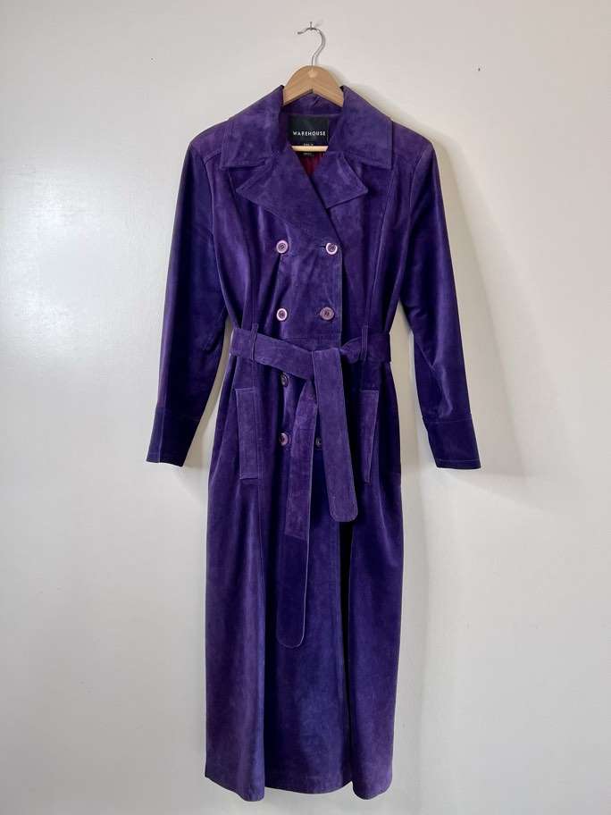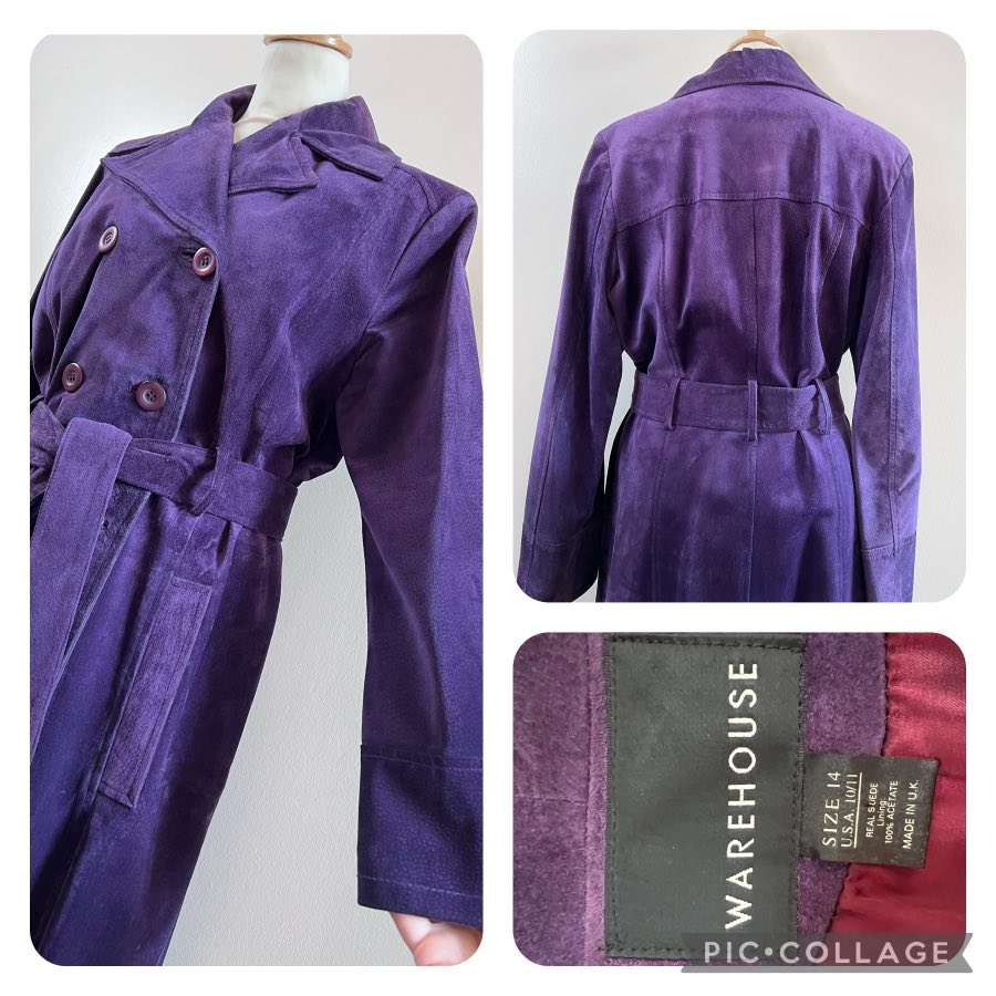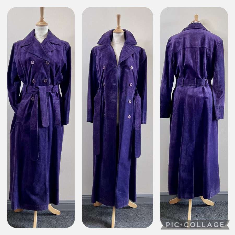 Description: Outstanding 1970s classic trench coat with original belt. Deep purple suede in super condition. Fold down collar. Double breasted front with double row, of original self coloured, buttons.